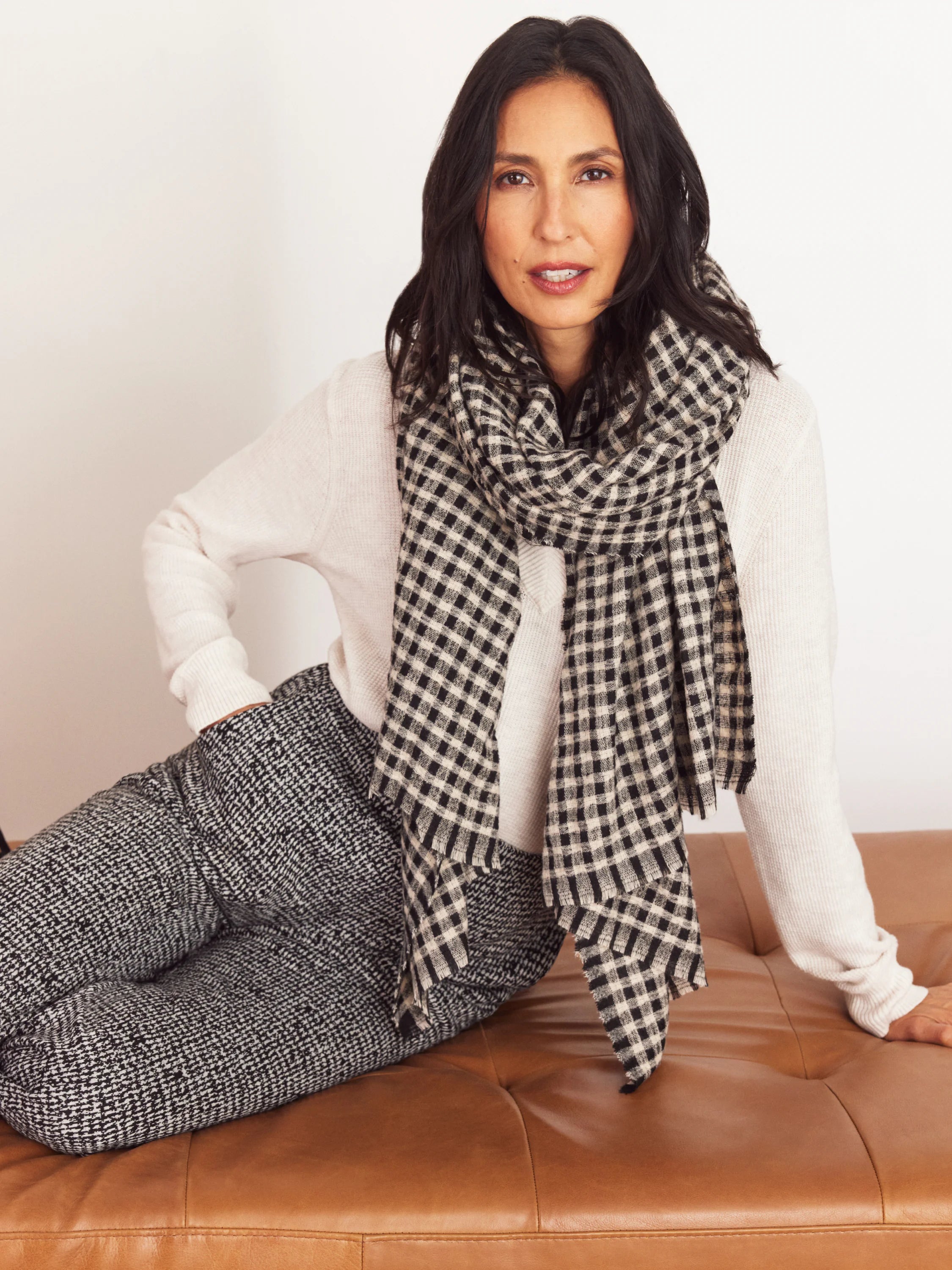 Keep cozy in our Bi Color Scarf. As snuggly as a blanket in a super chic black and ivory small check pattern.