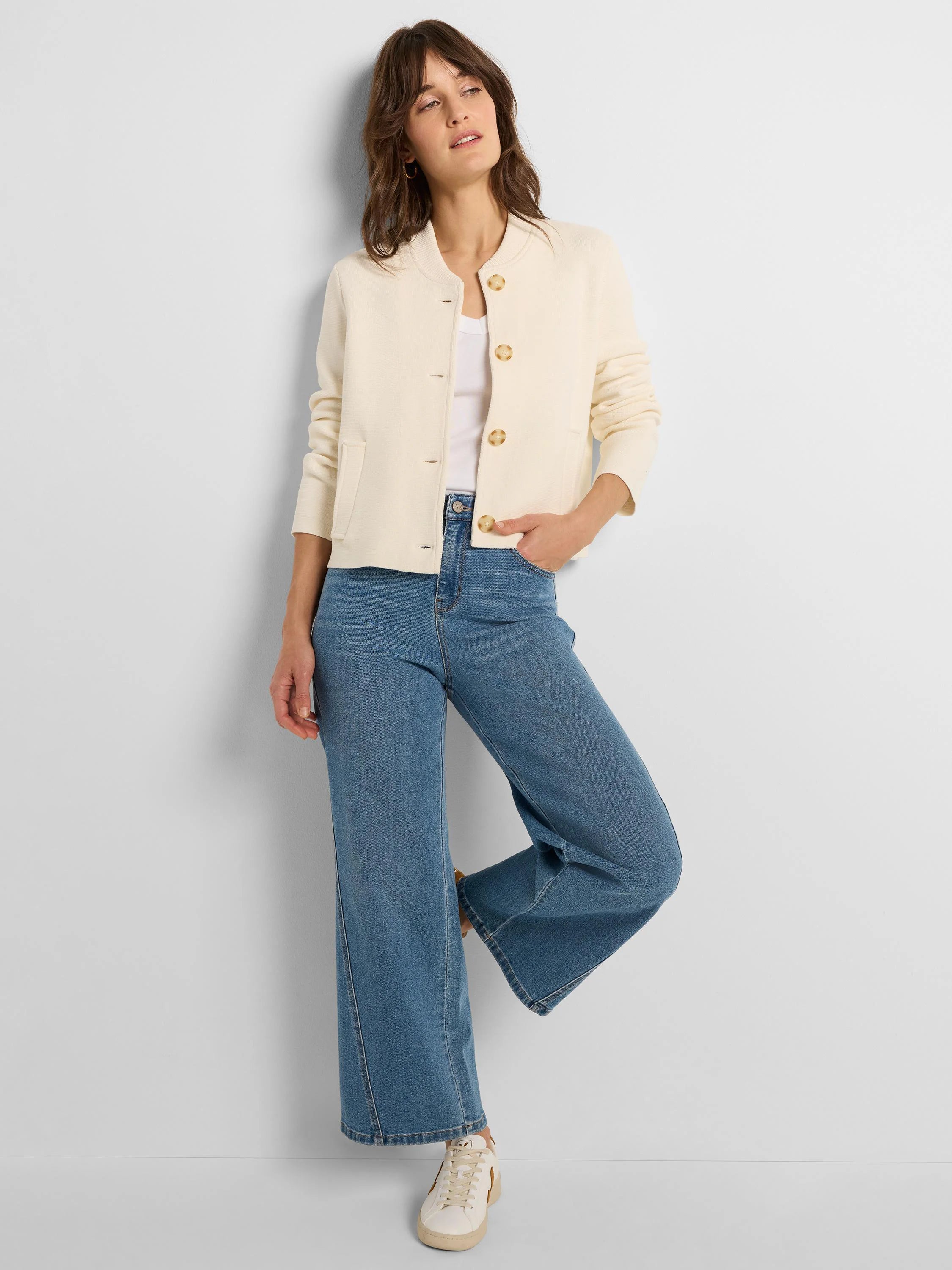 Level up your layers. Blending modern style with anytime versatility and all day comfort, the Knit Bomber Jacket is the layer you can't help but love. Crafted in a full Milano knit with rib trims, this modern must-have silhouette features a ribbed collar, functional welt pockets, and a full button front. Unlined and midweight, it's a perfect layer over dresses or paired with pants and denim for an elevated, effortless look.
