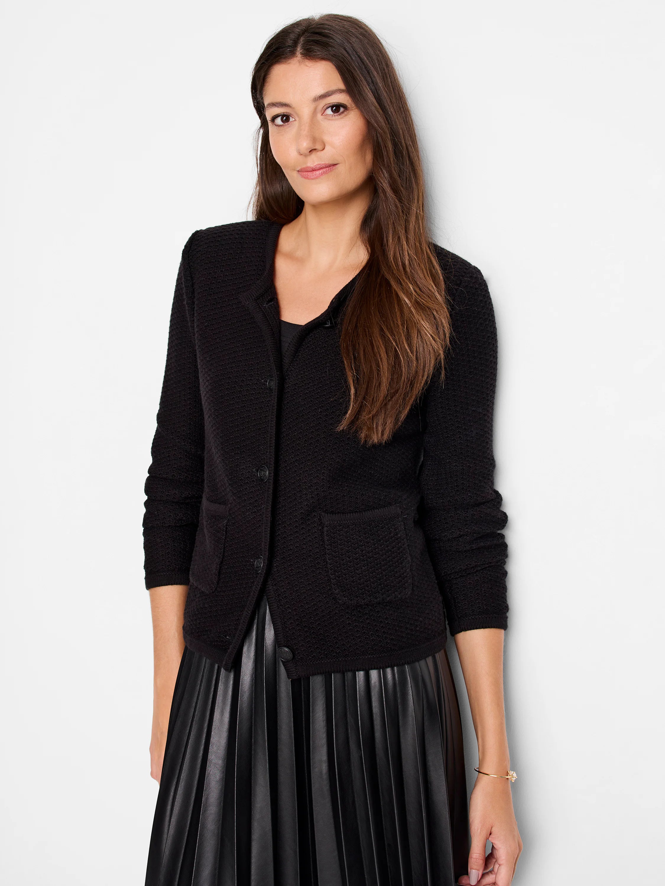 The comfort, feel, and knit detailing of your favorite cardigan in a unique, sophisticated shape. The Textured Sweater Jacket features a full button front with contrasting buttons, a luxe knit feel, texture that shows off the quality and craftsmanship plus just the right amount of stretch and bounce. Dress it down with denim or with work pants or a skirt for a more elevated look. Mindfully Made from fully fashioned knitwear that reduces textile waste. Mindfully Made: Fully fashioned knitwear (or no waste knitwear) is knit to shape, then each panel is linked together; meaning less textile waste.